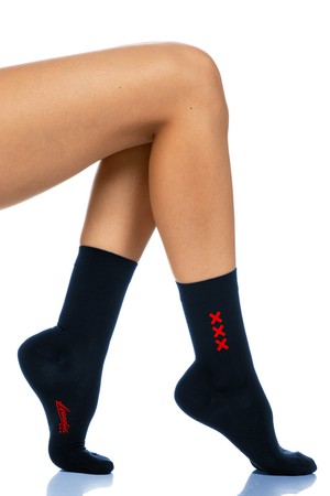 Real Amsterdam socks! These Navy blue socks are made of organic Cotton en have a red print of the three St. Andrews crosses in suède.