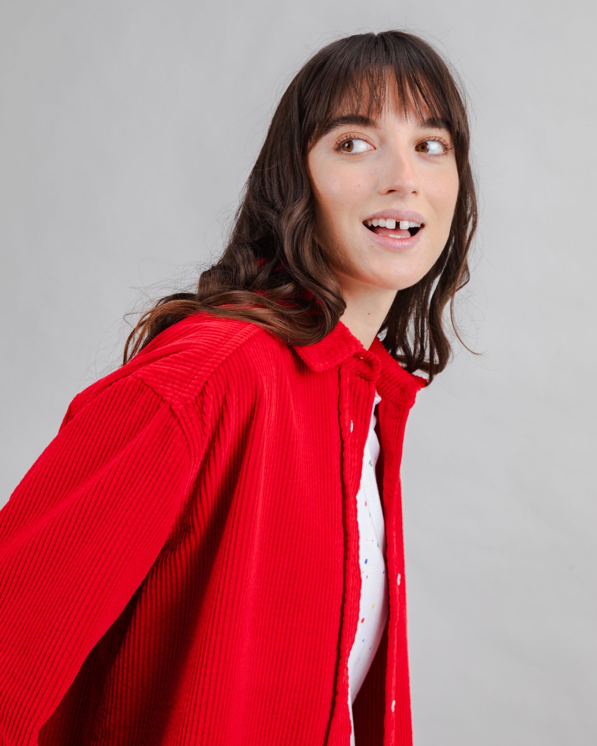 Step into effortless style with this striking red corduroy long overshirt. Crafted from soft organic cotton, its relaxed silhouette invites comfortable layering for cooler days. A standout sustainable piece to brighten your seasonal outfits with warmth and personality.