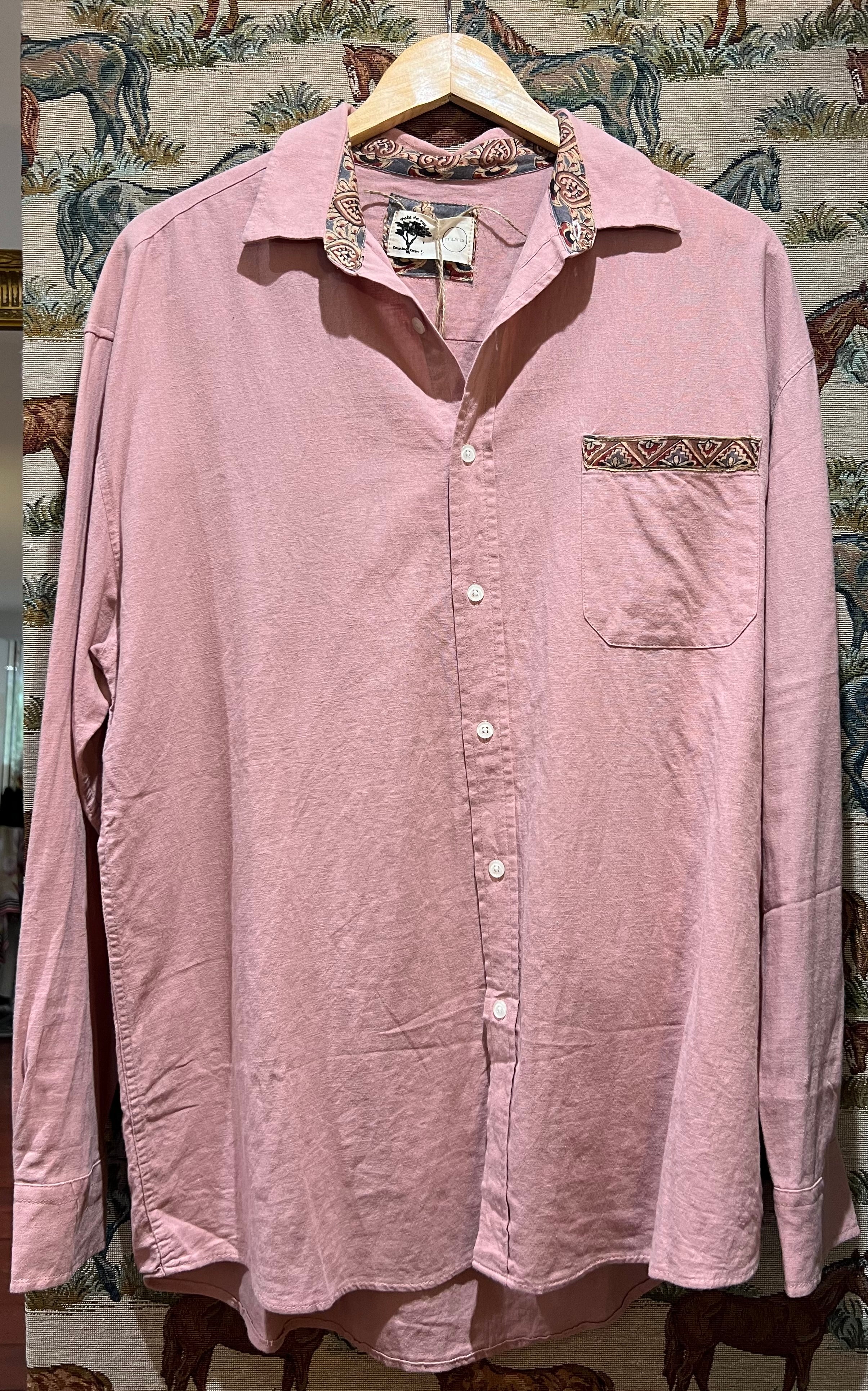Preloved, laundered and given new life with collected and re used patterned cotton fabrics added to collar and cuffs.