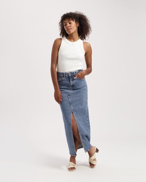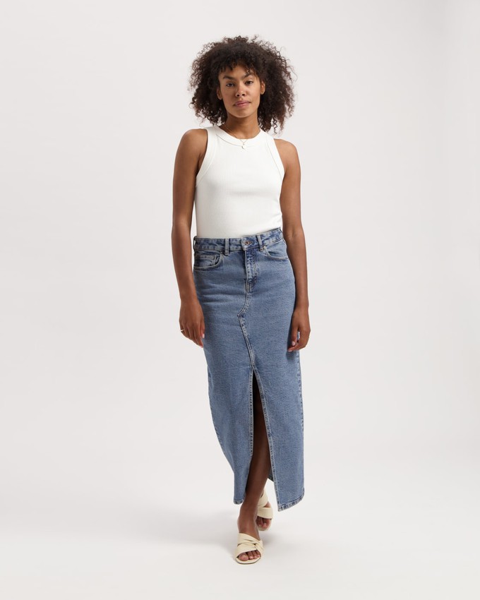 The Coda is our midi denim skirt with a front slit. Pair this '90s-inspired midi skirt with knee-high boots for an elegant look, or with sneakers for a more rugged style. The Coda is made from regenerative cotton. Regenerative farming practices improve soil health, increase biodiversity, and balance ecosystems.