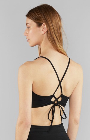 Sustainable bikini top from the brand Dedicated in a timeless black color. The bikini top is made of rPET (recycled PET bottles), making it soft and slightly shiny. The model has (removable) padded triangle cups with wide underband. The ties are crossed at the back and have a tie closure there, allowing you to easily tighten or loosen the bikini.