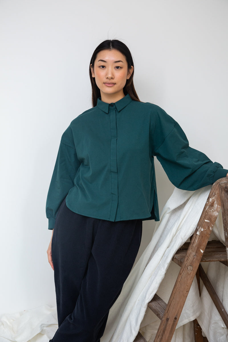 The Konara is a modern take on traditional shirting, featuring a balloon sleeve with elasticated cuff and box pleat detail at the back.