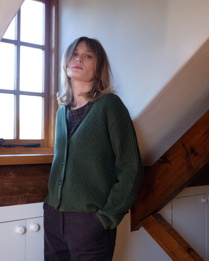 Snow has designed a new heavyweight knit cardigan for this season that will become a favourite. This thick Fisherman rib knit cardigan is a beautiful layering piece made in soft, durable, and pure Merino lambswool. Made in a rich green yarn, it has subtle drop shoulders and a straight, slightly cropped fit, making it easy to wear with skirts and trousers. The yarn we use comes from a Scottish mill that has been making yarn for over 200 years; in the spinning, it has been given an extra twist to make it stronger and help prevent pilling. The buttons are corozo. We are proud to bring you thoughtfully made clothes designed with comfort and wearability in mind. They are clothes to invest in and enjoy for many seasons.