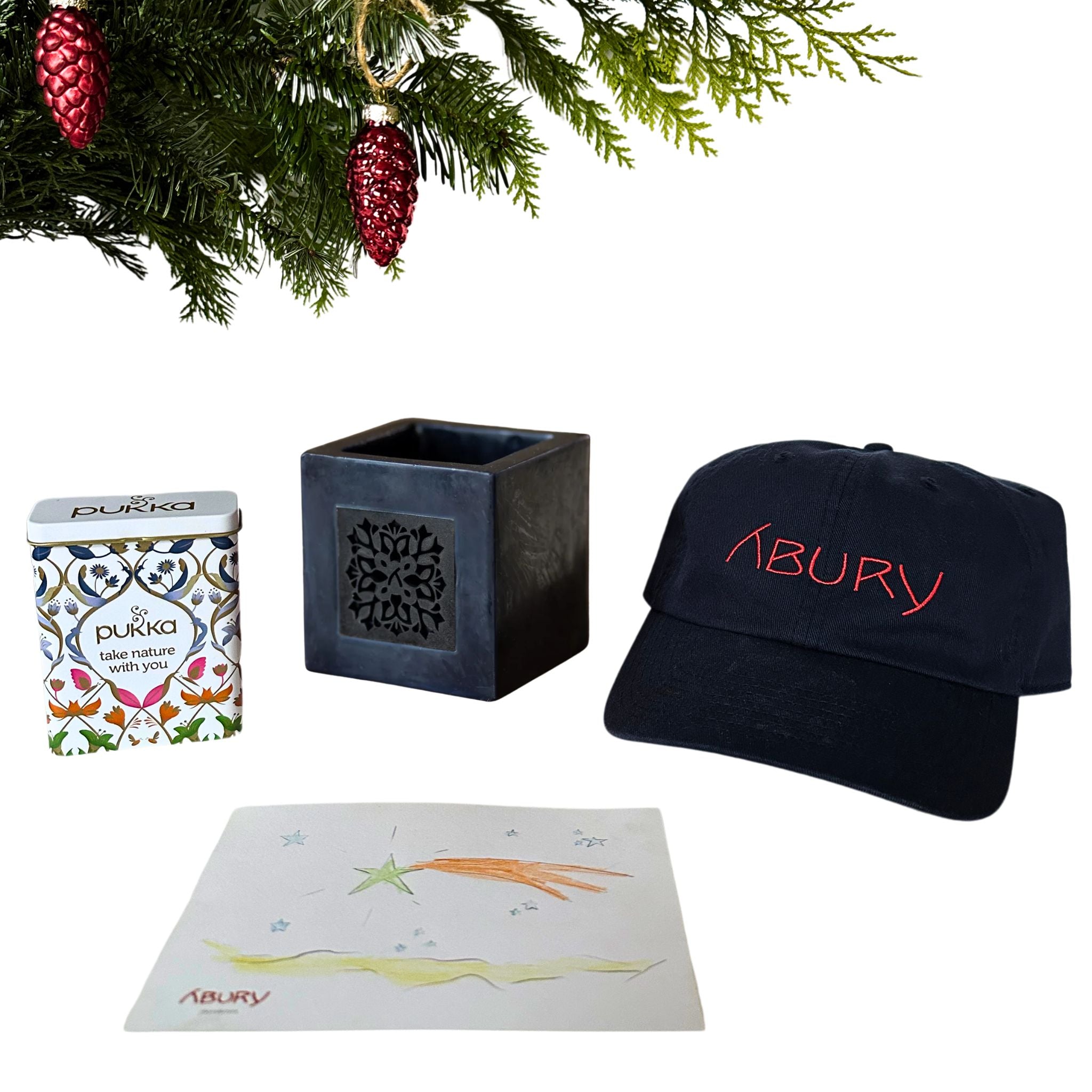 The ABURY Supporter Christmas Set brings together four special elements: a high-quality navy cap with red ABURY embroidery, a handcrafted wax lantern for cozy winter evenings, a small Pukka tea tin, and a hand-painted postcard from our preschool in Douar Anzal.