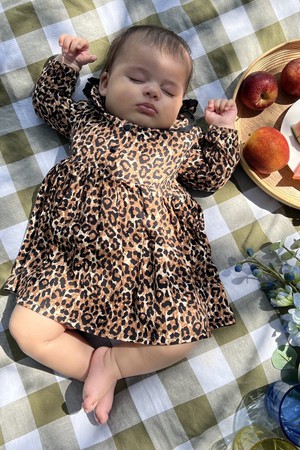 The bumble animal print dress is a mini version of our fabulous new Coco Collar nursing dress. It has the same gorgeous collar with contrast frill trim, delicate little contrast button front and it’s made from the same beautiful printed fabric as mummy’s.