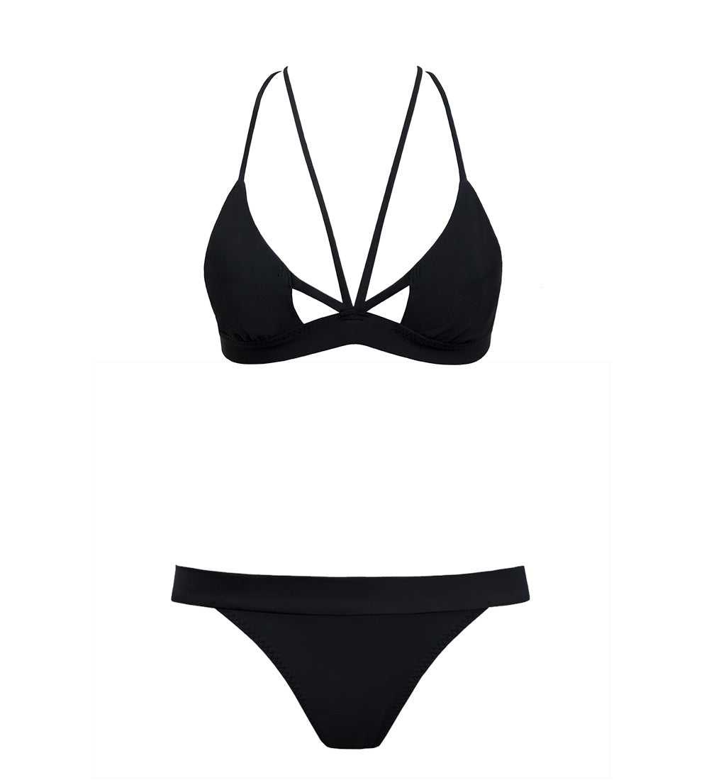 Triangle bikini top with a detailed front and slim straps that merge into a crossed back. The underbust band provides support, and the lacing allows it to be perfectly adjusted. Minimalist design for the perfect fit, feel and style. Here combined with a bikini panty with a low waist and wide thong sides with a soft elastic band that gently hugs your hips.