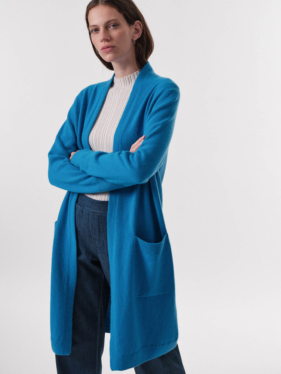 A feel-good must-have: a warm knitted coat made of organic wool and organic cotton. The wide knitted cuffs on the sleeves and the large patch pockets add a fashionable touch. Whether in subtle, classic or fashionable, bright colors - the long coat in a wide fit can be combined with everything and every occasion.