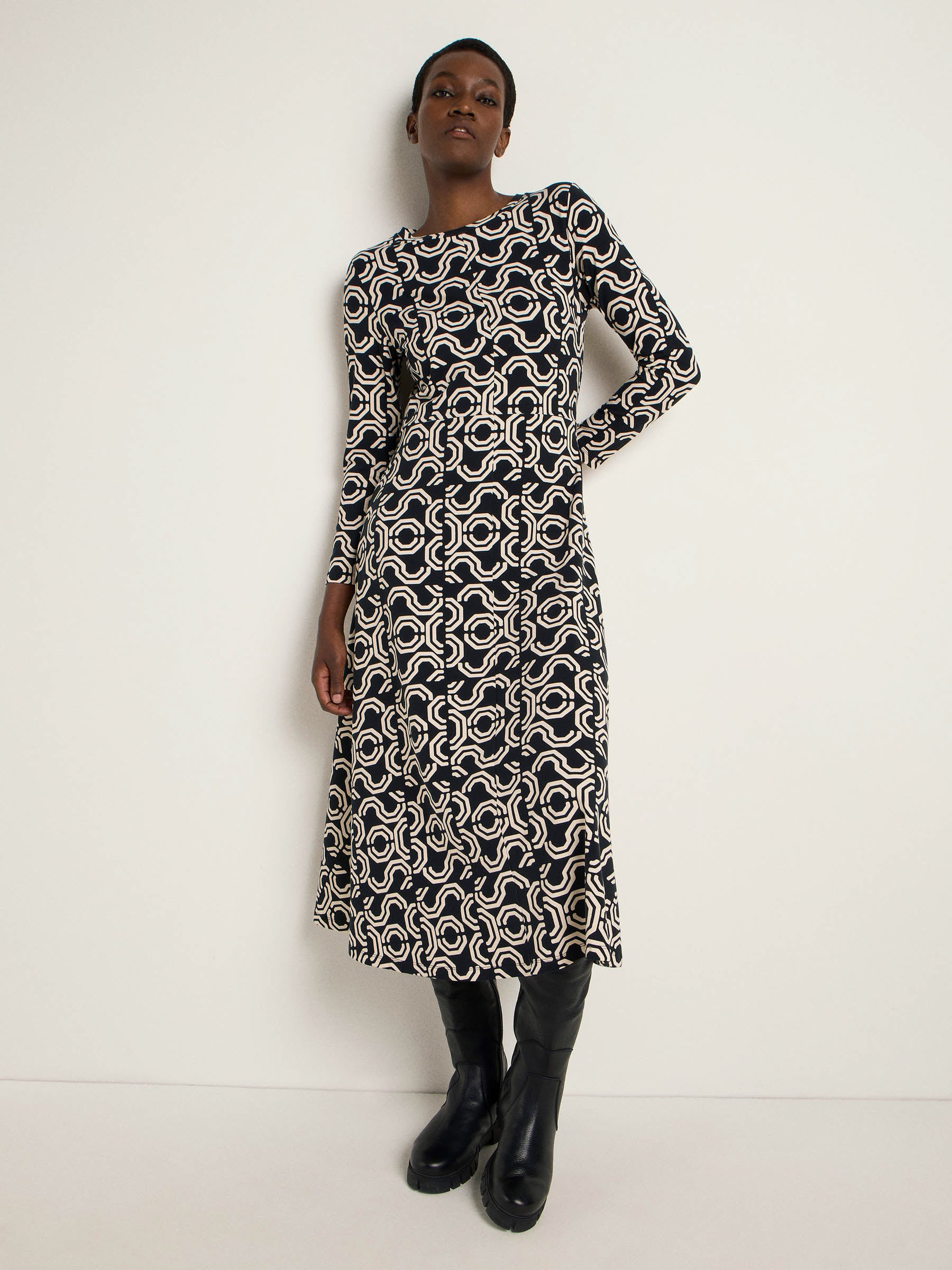 LANIUS classic in all-over print: The sheath dress, fairly produced and vegan, softly flowing with a perfect fit. The tried and tested material mix of organic cotton, TENCEL™ and elastane is opaque, elastic, supple and shape-retaining - the waist panel gives the waist a particularly shapely silhouette. High neckline, long sleeves and slightly flared skirt are sporty details.