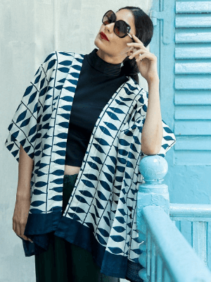 The Leaf is an elegant navy and white Kimono style jacket in 100% Natural Eri Peace silk. An elaborate body of navy blue leaf and stem with a bold navy blue border highlighting the design throughout the front and back. These kimonos have a fluid silhouette and can be used as an overdress or coat, over a simple top and bottom or even a dress. They hang loose with drop shoulders and wide sleeves. The side slits making it an extremely comfortable wear. Slow fashion at its best these are suitable as formals, and easily converts your day look to an evening wear.