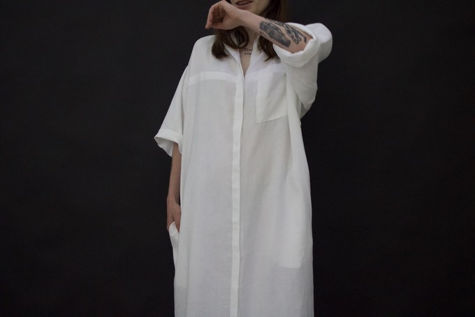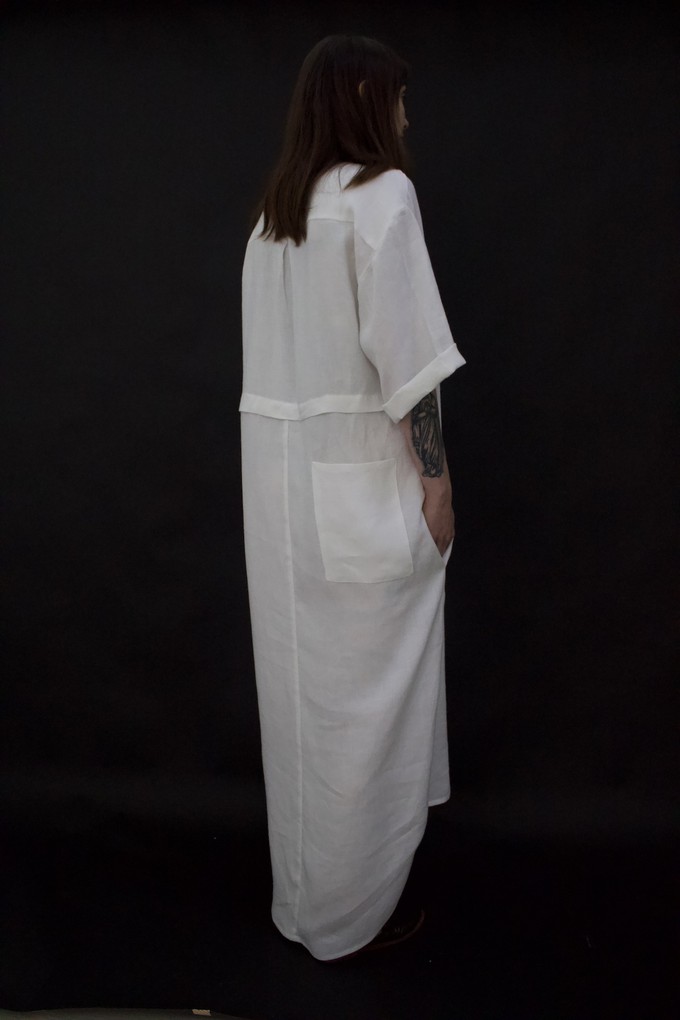 This Dia shirtdress is created out of Belgian Linen. Wear it loose or tied with the waist band like a shirtdress, or open over a top and pants. The longer hemline in the back creates the feeling of a real cocoon.