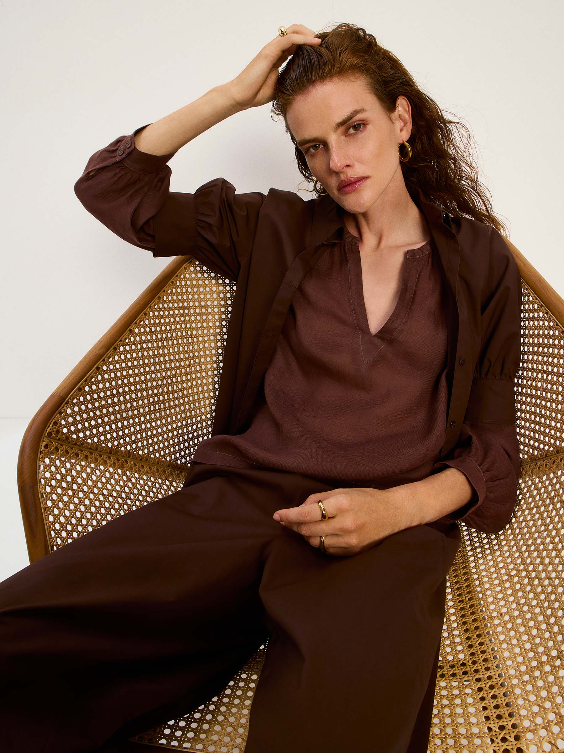 Diese Bluse aus leichtem Ramie-Material überzeugt durch ihre weich fließende Qualität und eine entspannte Silhouette. Der dezente V-Ausschnitt und die feinen Raffungen im Schulterbereich verleihen dem Design eine subtile Eleganz. Angenehm leicht auf der Haut und vielseitig kombinierbar!