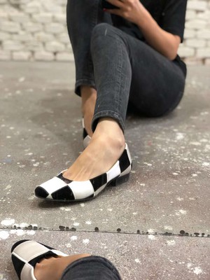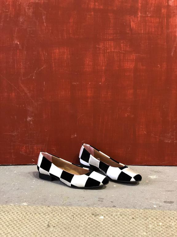 The spectacular design is inspired by chess. The squares velvet blacks and satin whites make a unique combination, they are to fall in love with! It is super comfortable, with a semi-square toe that greatly stylizes the foot and leg.