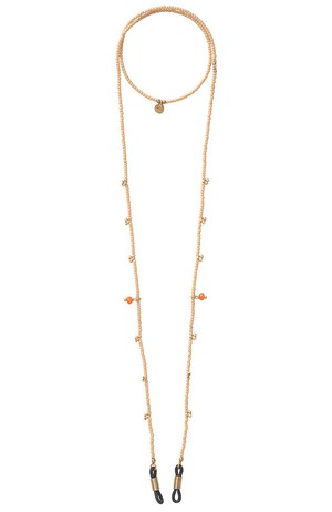Beautiful eyewear lanyard from A Beautiful Story in shades of orange and and gold with a small carnelian stone. The carnelian stone represents courage, change and creativity.