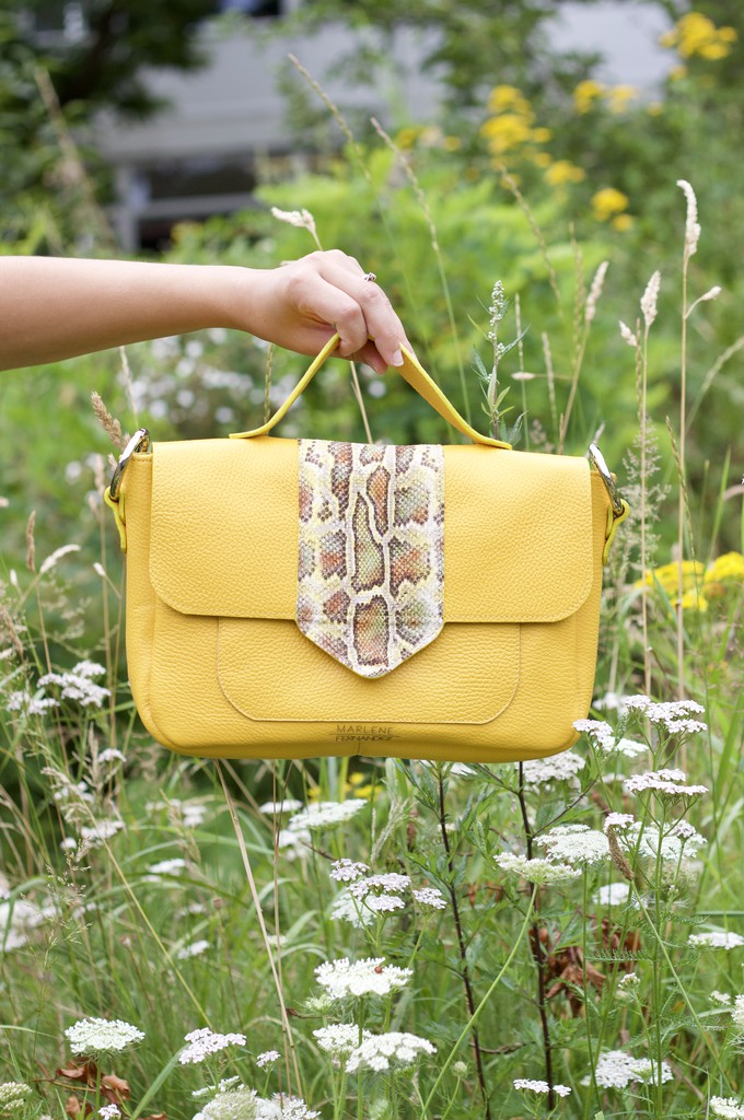 Soft yellow leather with a snake printed flap.