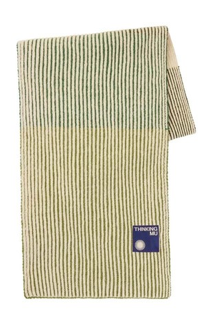 Extrafine wool multi-colour scarf with Thinking MU patch on front left.