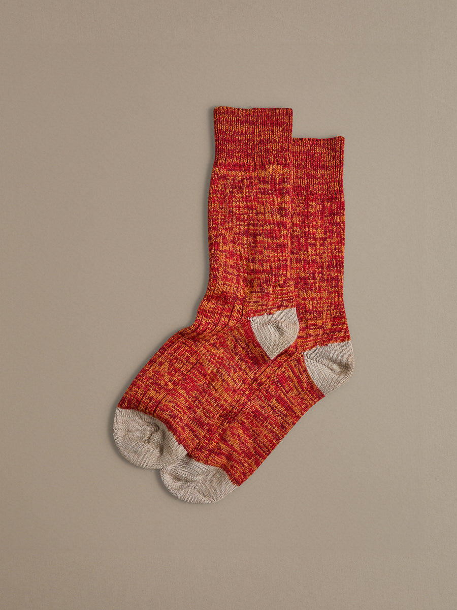 Try our chunky ribbed wool socks, designed for comfort, durability, and everyday adventure. Knitted in a striking marbled pattern of Red and Orange, each pair brings a subtle pop of colour while staying timelessly practical.