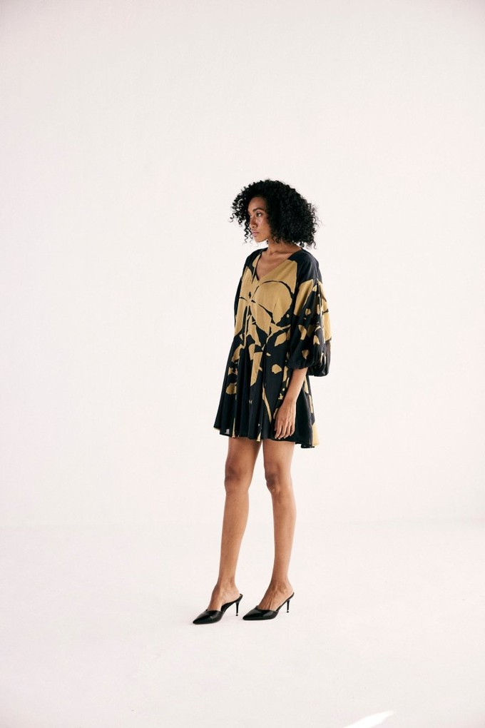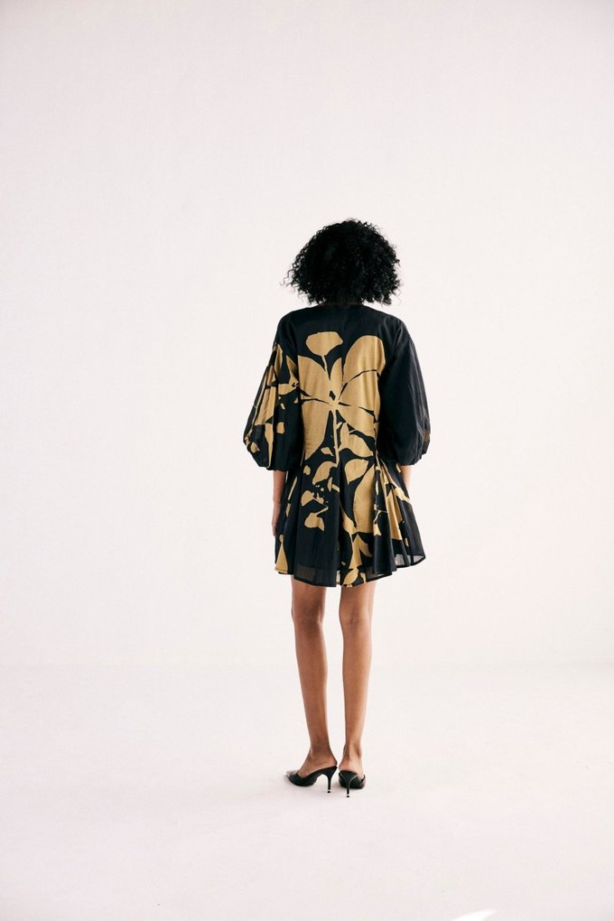 A statement black floral scatter print mini flare dress. Dress is fully lined and crafted from the softest handloom cotton.