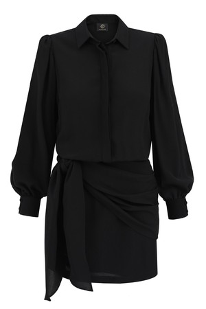 Charlotte black dress is a stylish cocktail dress. The dress has a loose cut, shirt-like top buttoned with a concealed placket, sleeve with a slight buffet with a two-button cuff. The bottom of the dress is slightly before the knee with a tied longer sash. The dress is zippered at the side, and has an invisible elastic at the back waist for a snug fit at the waist and hips. The dress is made of matte viscose in classic black. The bottom of the dress is lined, fabric-coated buttons.