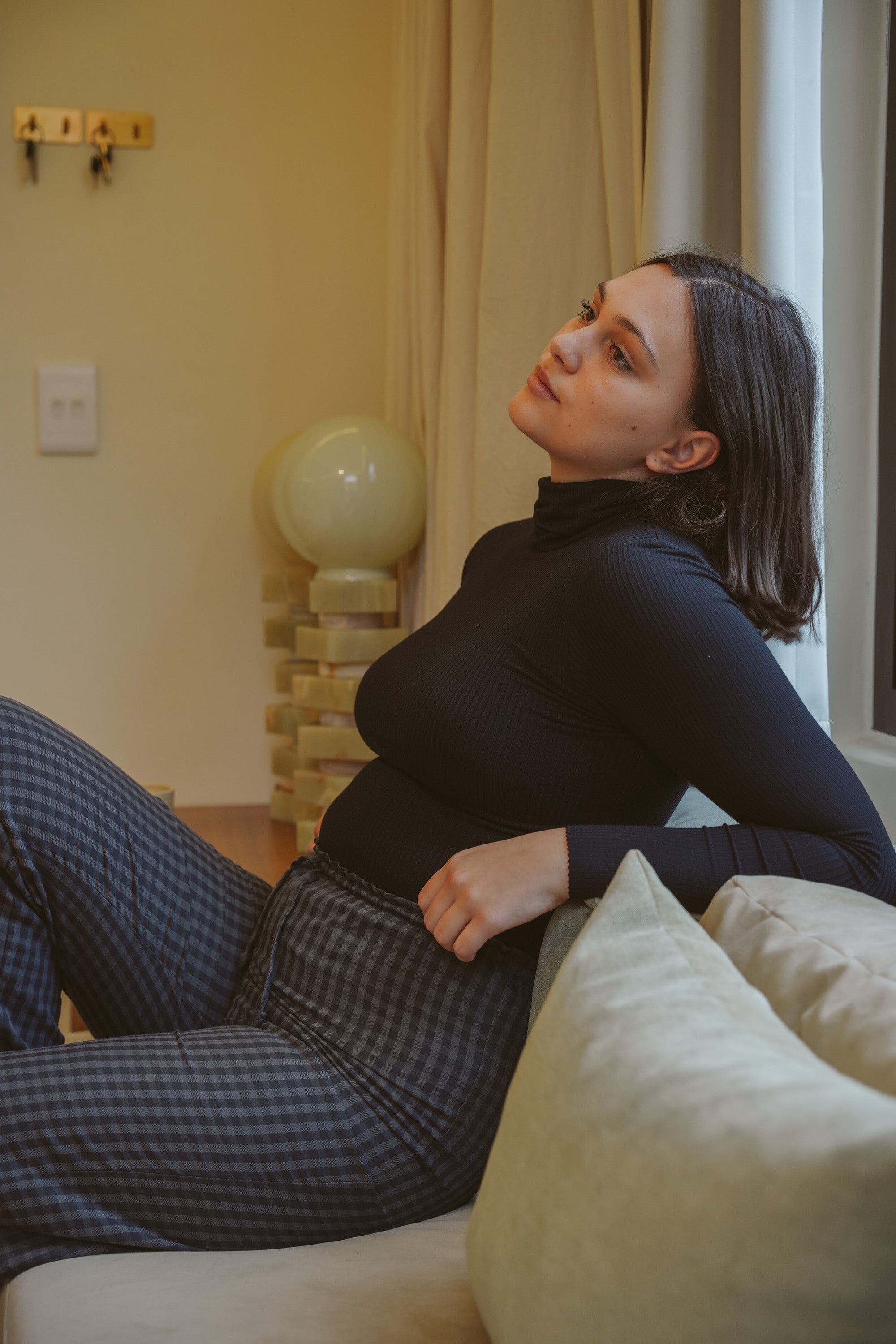 The longsleeve Turtleneck. Our ribbed fabric is extremly soft and very stretchy. It adjusts very well on a big or small bust. Great to wear without any bra underneath due it’s two fabric layers. After several washing the zick-zag hem frays a little bit. A perfect match with your favourite jeans or our cozy leo pants.