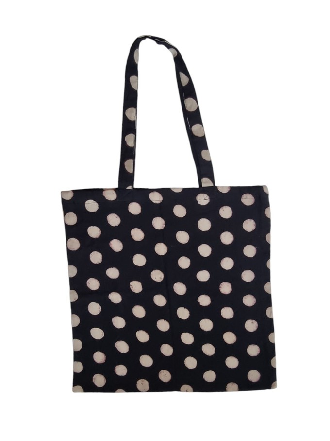 A hand printed cotton tote bag that can be used for all your shopping needs. This design features a black and ivory polka dot print that has been printed by artisans in India. This bag has been made from our excess fabric, which helps reduce our waste.