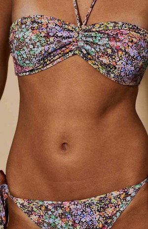 Durable bandeau bikini top from Denmark's Underprotection featuring cheerful florals. The bikini features a bandeau style with an adjustable cord that runs from the center up around the neck, cups with removable padding and a gold-tone closure at the back.
