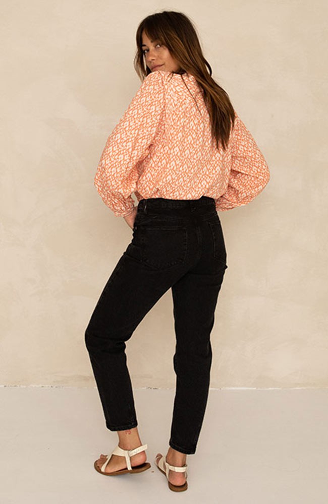 Feminine yet cool peach-orange colored blouse from JLABEL. The blouse is made of recycled cotton and viscose (leftover material). It features a wide fit, seam with pleats above the chest and cap shoulder.
