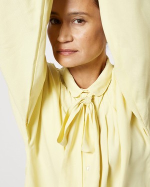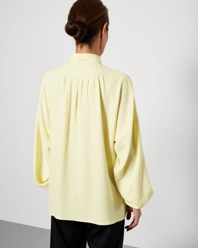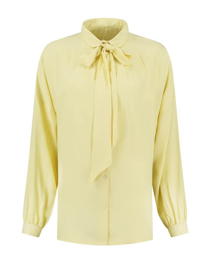 Eye-catching versatile blouse. The Bow is detachable and is great to wear as a belt or hair ribbon as well. The sleeves have a subtle puff to them and the blouse has a round neckline with a rounded collar. Beautiful stitching around the shoulders and small twin shell buttons.