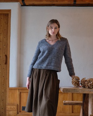 This V-neck hand-knitted textured grey jumper is made from a special hand-spun and hand-dyed yarn. The yarn is a mohair/sheep wool blend and is both warm and light. Its simple, timeless design features moss stitch detailing on the cuffs and hem for added texture. This beautifully made knitted jumper is comfortable and easy to wear—it will keep you warm and cosy for many winters. What makes these knits truly special is the artistry behind them. Each one is meticulously crafted by skilled artisans, often in their own homes, taking a week to complete – they are the essence of slow fashion. We honour their exceptional craftsmanship with a signature on the label, making each jumper a unique piece that blends quality and personal touch.