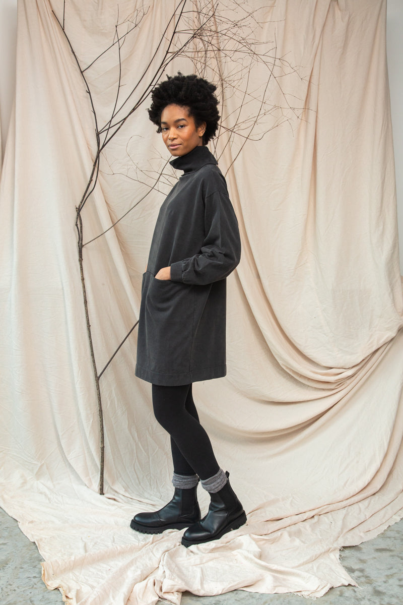 The Tricia is a funnel necked sweatshirt dress with an above knee hemline, straight cut skirt, and two integrated front pockets.