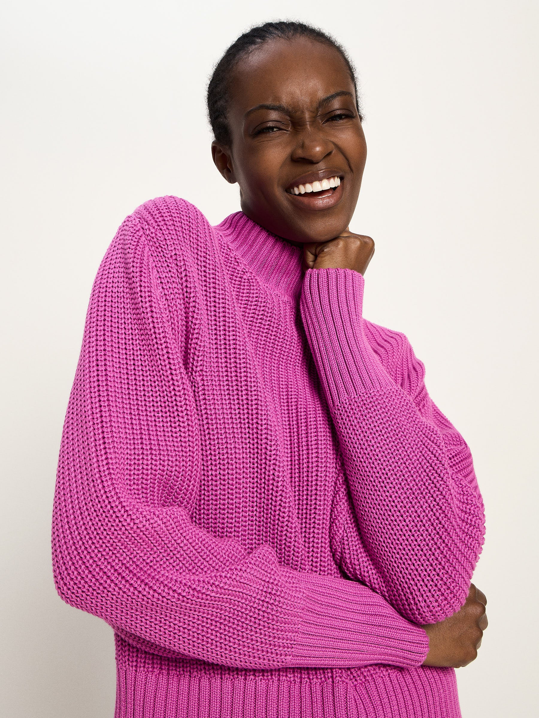 Ein Klassiker im modernen Look: Der Grobstrickpullover aus reiner Bio-Baumwolle überzeugt mit seiner klaren, voluminösen Struktur und dem legeren Schnitt. Der leicht erhöhte Rundhalsausschnitt sorgt für eine zeitlose Silhouette, während die breiten Rippbündchen an Ärmeln und Saum den entspannten Fit harmonisch abrunden. Die hochwertige Bio-Baumwolle macht den Pullover besonders angenehm auf der Haut. Ein vielseitiger Begleiter, der sich mühelos von casual zu elegant stylen lässt – von Denim bis Rock.