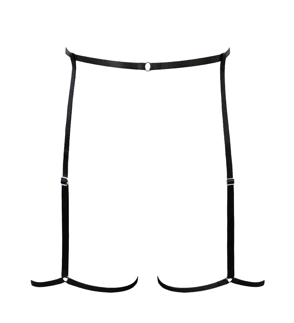 It's all in the legs. Our minimal but powerful strappy bondage suspenders, made entirely from high quality elastics. Features adjustable front and back garter straps for the perfect fit, and o-ring details at the waist and legs. Designed to match with the Sophia Bralette and Thong, but also match perfectly with Jade, Black Amber, Cayenne, Aurora, Darling and Earth sets.