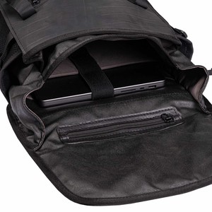 The bag is handmade using reclaimed military canvas and the reclaimed rubber of tyre inner tubes. The materials combine to ensure that the bag is hard wearing and waterproof. The storage space can be adjusted as desired using the compression straps on the sides. The back of the backpack and adjustable shoulder straps are cushioned to make the backpack sit comfortably.